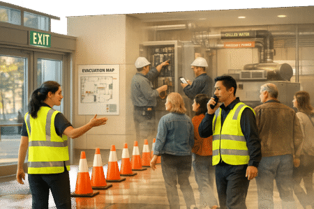 How event staff handle immediate crowd safety and evacuations while property teams manage infrastructure protection and long-term recovery.