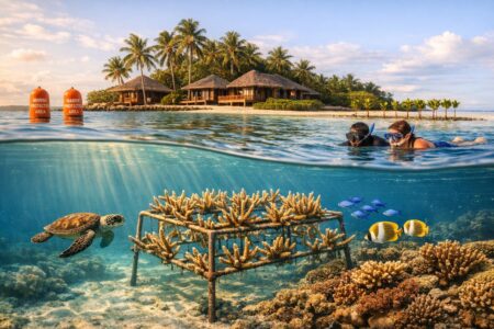 Island resorts fund MPAs, restore coral and mangroves, train local stewards, and run guest-led and ethical wildlife programs with measurable ecological gains.