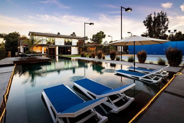 Outdoor Pool and seating area and basketball court
